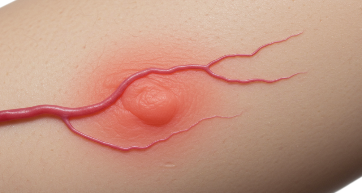 静脈のこぶ(静脈瘤)に血の固まり(血栓)ができて炎症を起こす状態です。強い痛みや周囲の熱感をもちます。