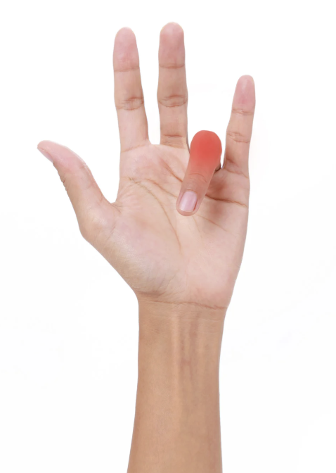 多くの場合、第二関節で症状が現れます。親指の付け根の関節や第二関節での痛み、指の可動域の制限、指を伸ばすときの引っ掛かり感やバネのように伸びる現象が見られます。